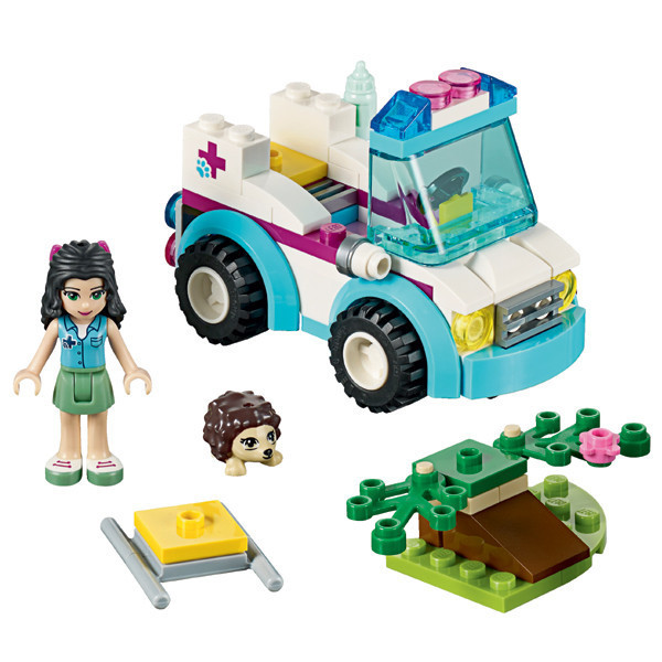 Запрыгивай в машину ветеринарной скорой помощи и отправляйся спасать животных, попавших в беду! Ежик, играя в кустах, упал с ветки. Помоги Эмме осмотреть ежика. Дай ежику попить из бутылочки и положи его на носилки, чтобы отнести в машину скорой помощи. Объедини с набором Ветеринарная клиника 41085 LEGO FRIENDS , чтобы провести полную проверку здоровья ежика.
