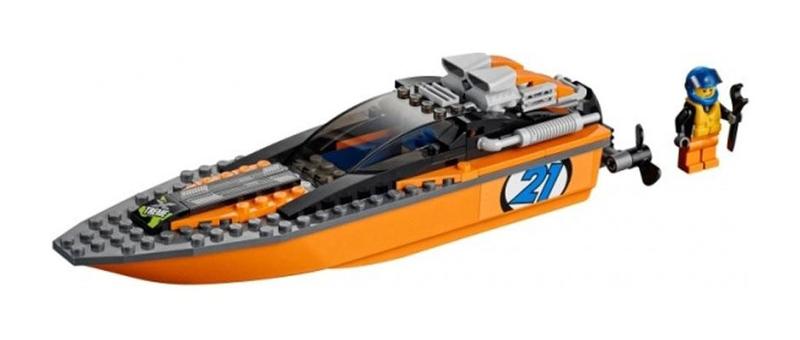 Проводится чемпионат по гонкам моторных катеров. Помоги команде моторного катера LEGO City участвовать в гонках. Садись в мощную полноприводную машину, заводи и отправляйся к берегу. Этот огромный оранжево-черный гоночный катер с затемненной кабиной и мощным подвесным поворотным мотором конечно претендует на победу, — это будет великолепный день гонки катеров!