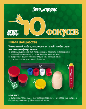 Искусство показывать фокусы — достаточно сложное. Чтобы обучиться ему, ребятам потребуется проявить немного терпения. Хороший фокус невозможен без тренировки, так же как и без правильного реквизита. В наборе юные мастера иллюзий найдут все необходимые принадлежности для того, чтобы научиться показывать 10 разнообразных фокусов.