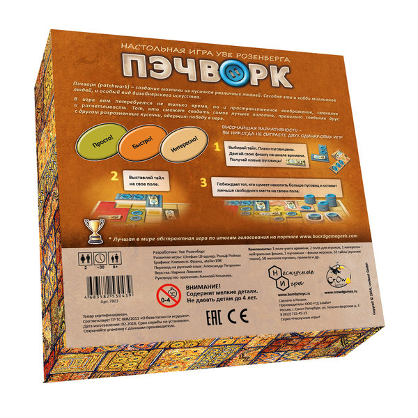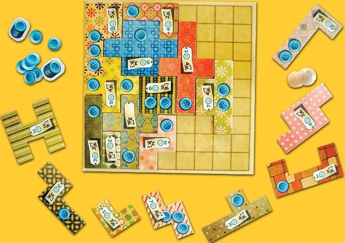Игроки соревнуются друг с другом, собирая самое целостное (и приносящее наибольшее количество очков) полотно из лоскутов ткани. Для начала разложите все тайлы (кусочки ткани) случайным образом вокруг поля учета времени и поместите наперсток перед тайлом, состоящим из двух клеток. Каждый игрок берет 5 пуговиц (это валюта в игре) и игра начинается!