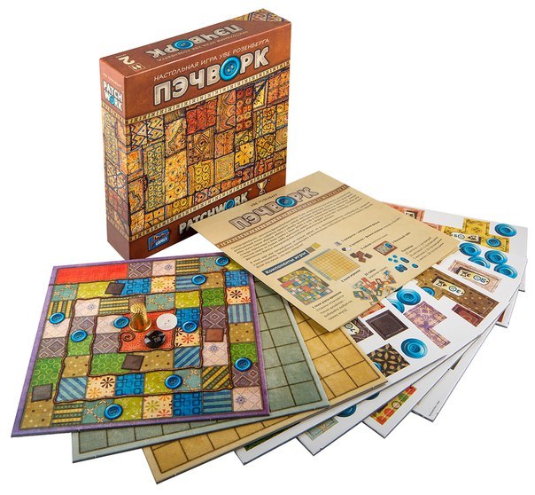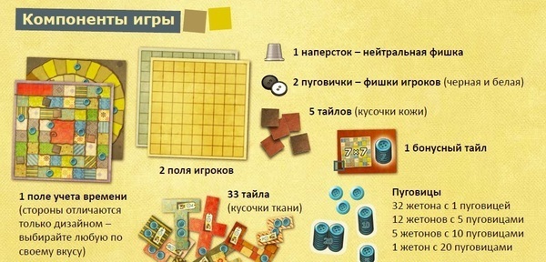 | Комплектация | -1 наперсток (нейтральная фишка) -2 фишки игроков (чёрная и белая) -2 поля для шитья -1 поле времени -33 лоскута -50 фишек пуговиц -1 бонусный тайл -Правила игры |